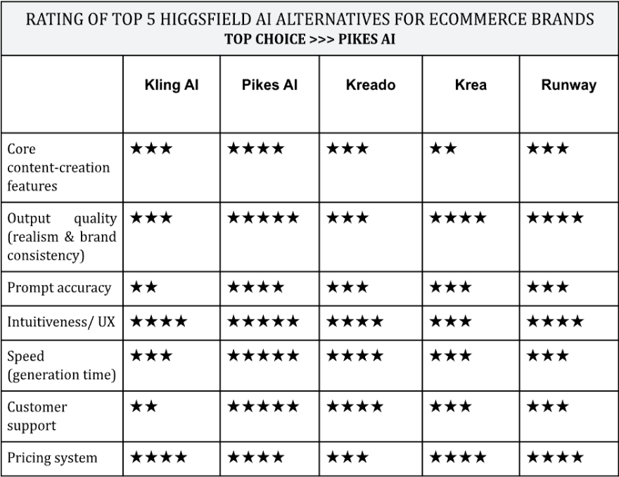 A table highlighting the rating of the best Higgsfield alternatives in 2025 based on key features