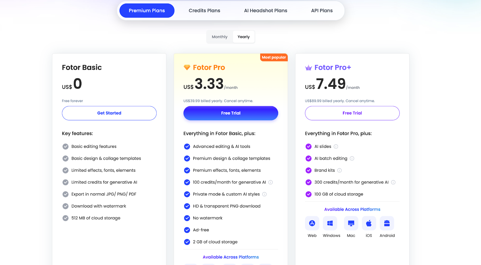 Fotor offers 4 kinds of plans: Premium, Credit, Headshot, and API plans.