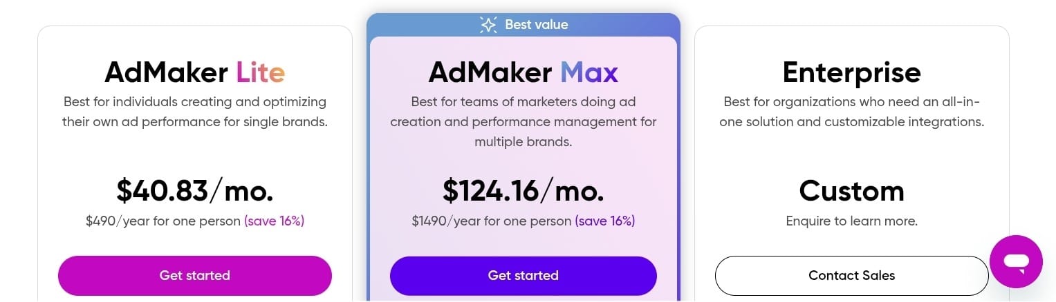 The Marketer Package includes the AdMaker Lite plan, AdMaker Max plan, and the Custom enterprise plan.