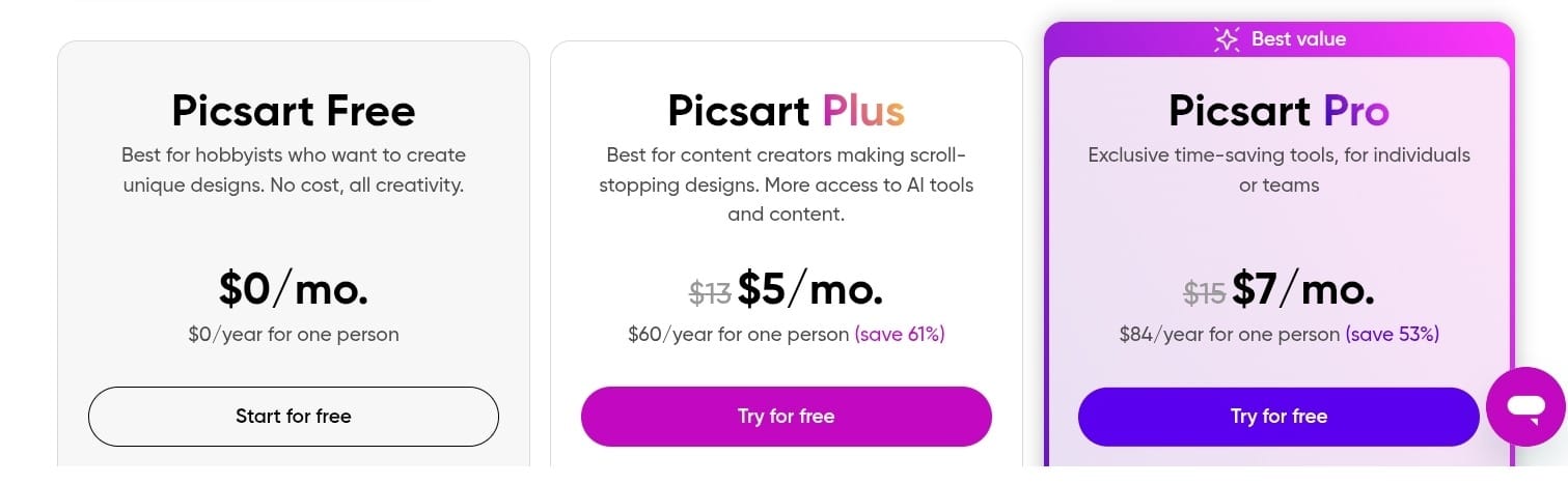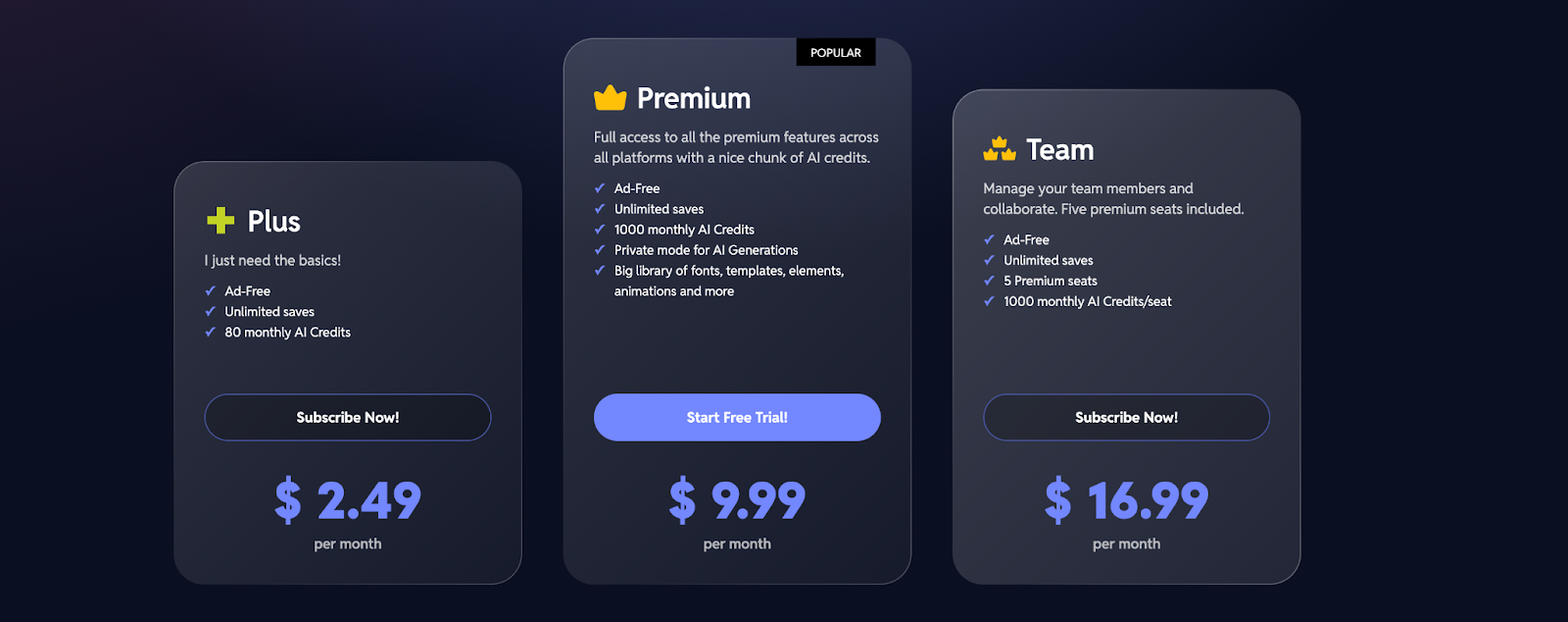 Pixlr has three pricing tiers, namely Plus, Premium, and Team.