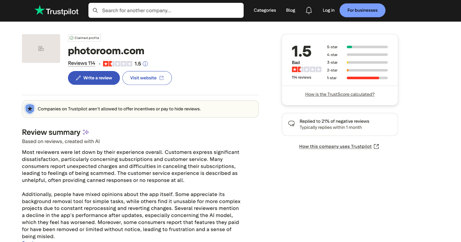 - Poor Customer Service: A common complaint on Trustpilot is Photoroom's unresponsive customer support to issues and complaints. This can be frustrating when you need immediate help in carrying out important tasks.